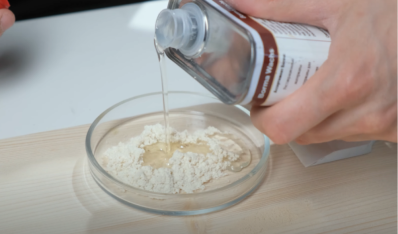 - Смешивание: В чистую емкость налейте необходимое количество Borma Holzmasse Base (3-4 части) и добавьте древесный наполнитель (1 часть) и пигмент (по желанию). Тщательно перемешайте до получения однородной массы.