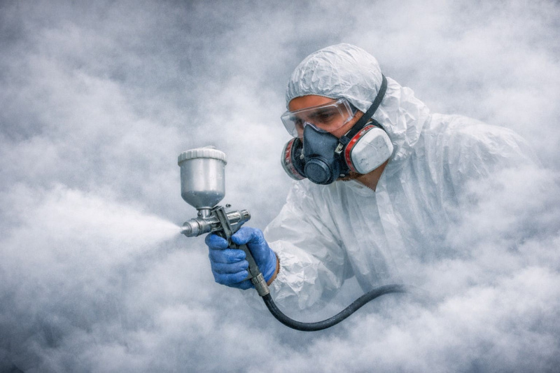 При работе с краскопультами маляры были вынуждены дышать в облаке мельчайшей лакокрасочной пыли. Даже при использовании респираторов риск отравления и хронических заболеваний легких был огромен. Также при больших объемах производства окрасочный туман оседал на землю, попадал в почву и воду, летучие органические соединения в составе красок создавали смог.