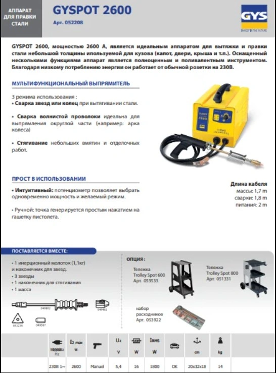 GYSPOT 2600, мощностью 2600 A, является идеальным аппаратом для вытяжки и правки стали небольшой толщины используемой для кузова (капот, двери, крыша и т.п.). Оснащенный несколькими функциями аппарат является полноценным и поливалентным инструментом. Благодаря низкому потреблению энергии он работает от обычной розетки на 230В.