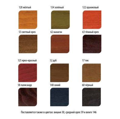 Различные цвета в производстве демонстрируют естественную красоту древесного зерна. Продукт готов к использованию, а характеристики делают ее идеальной заменой всем традиционным продуктам, таким как анилиновые порошки, избегая предварительной подготовки и вредного вдыхания порошков. Раствор может быть разбавлен любым растворителем, спиртом, ацетатом, разбавителем или водой в рекомендуемом соотношении 1:6 (более высокие разведения могут изменить цветовой эффект). Borma HOLZFARBE также можно использовать в качестве пигмента для прозрачных лаков.