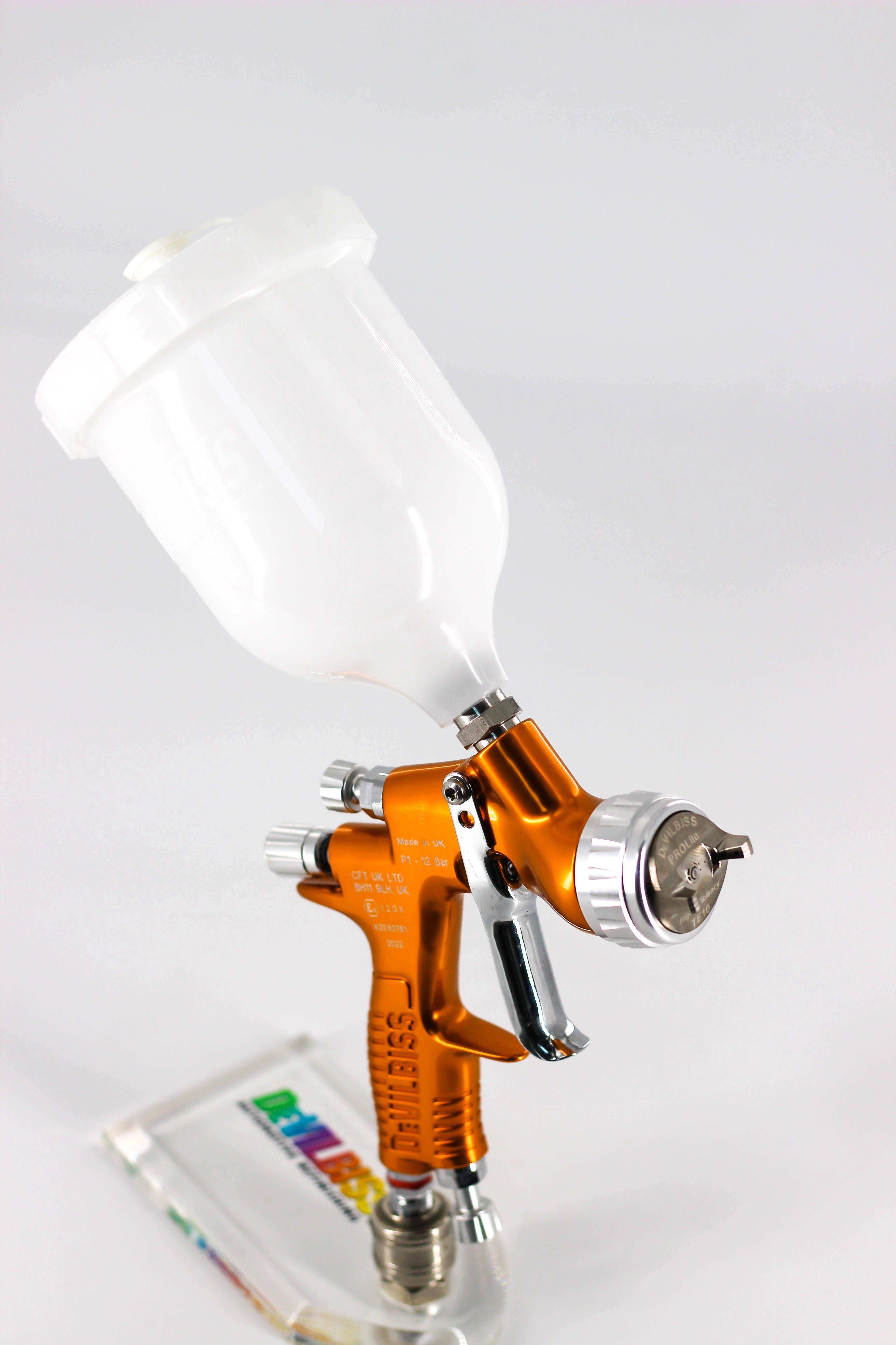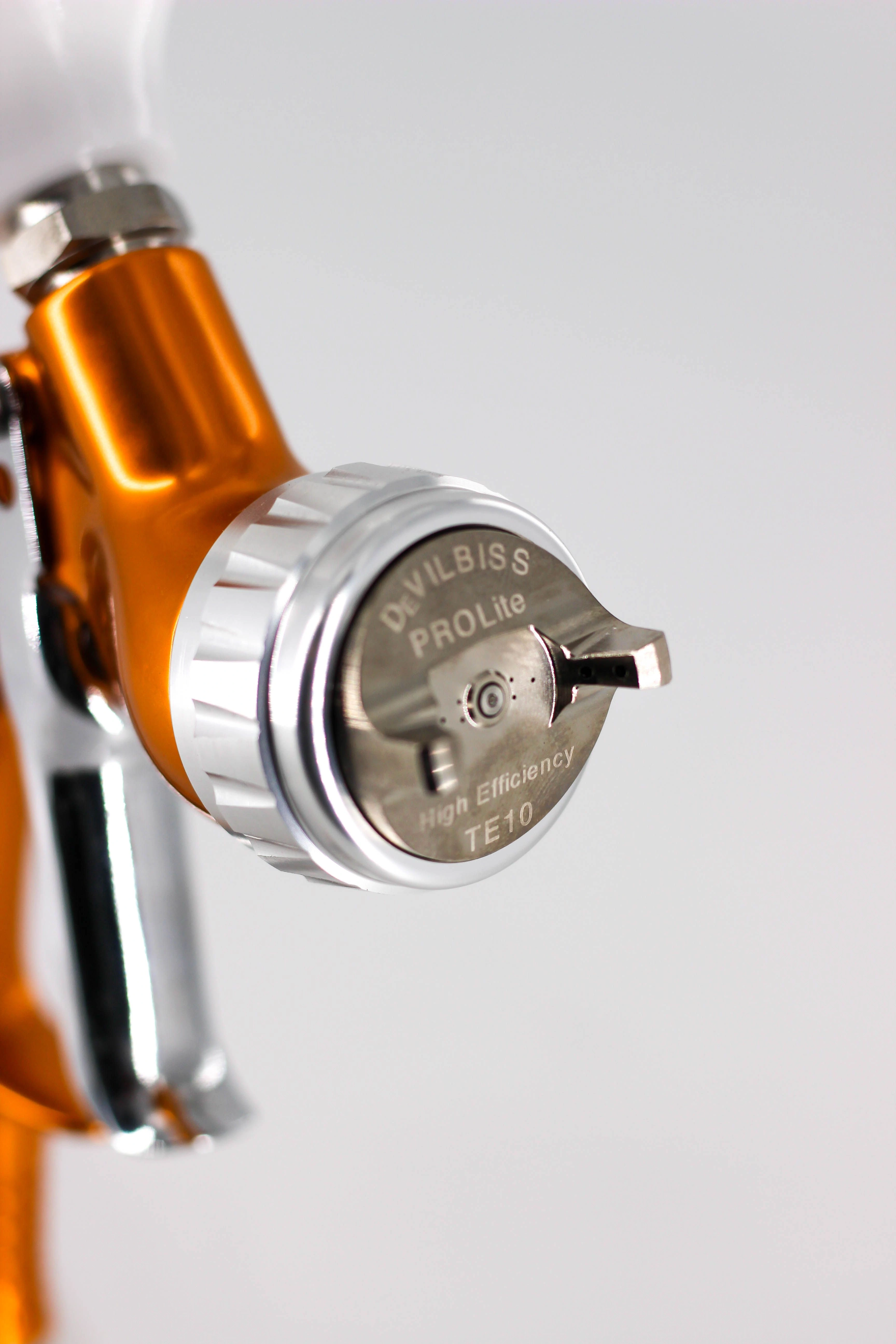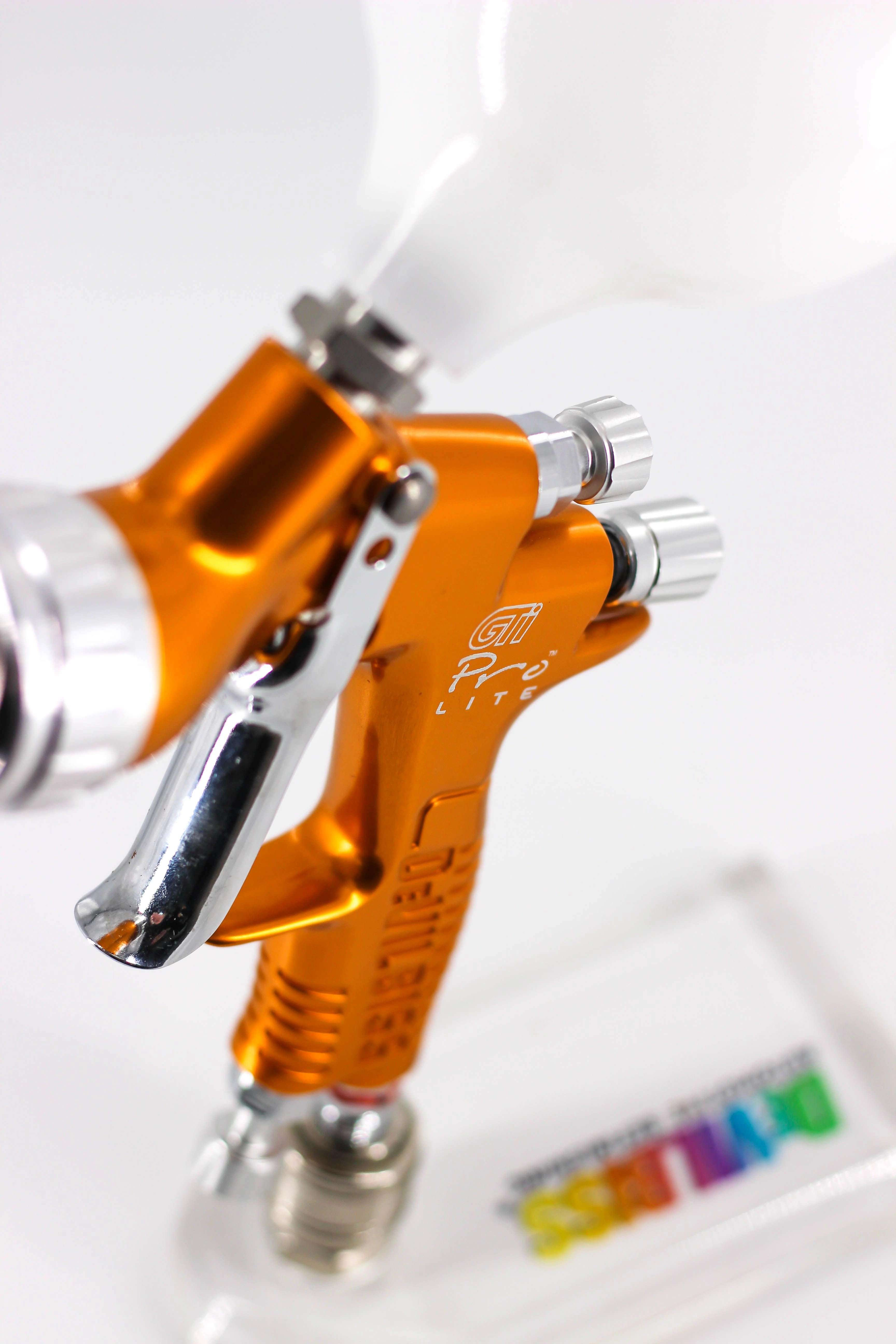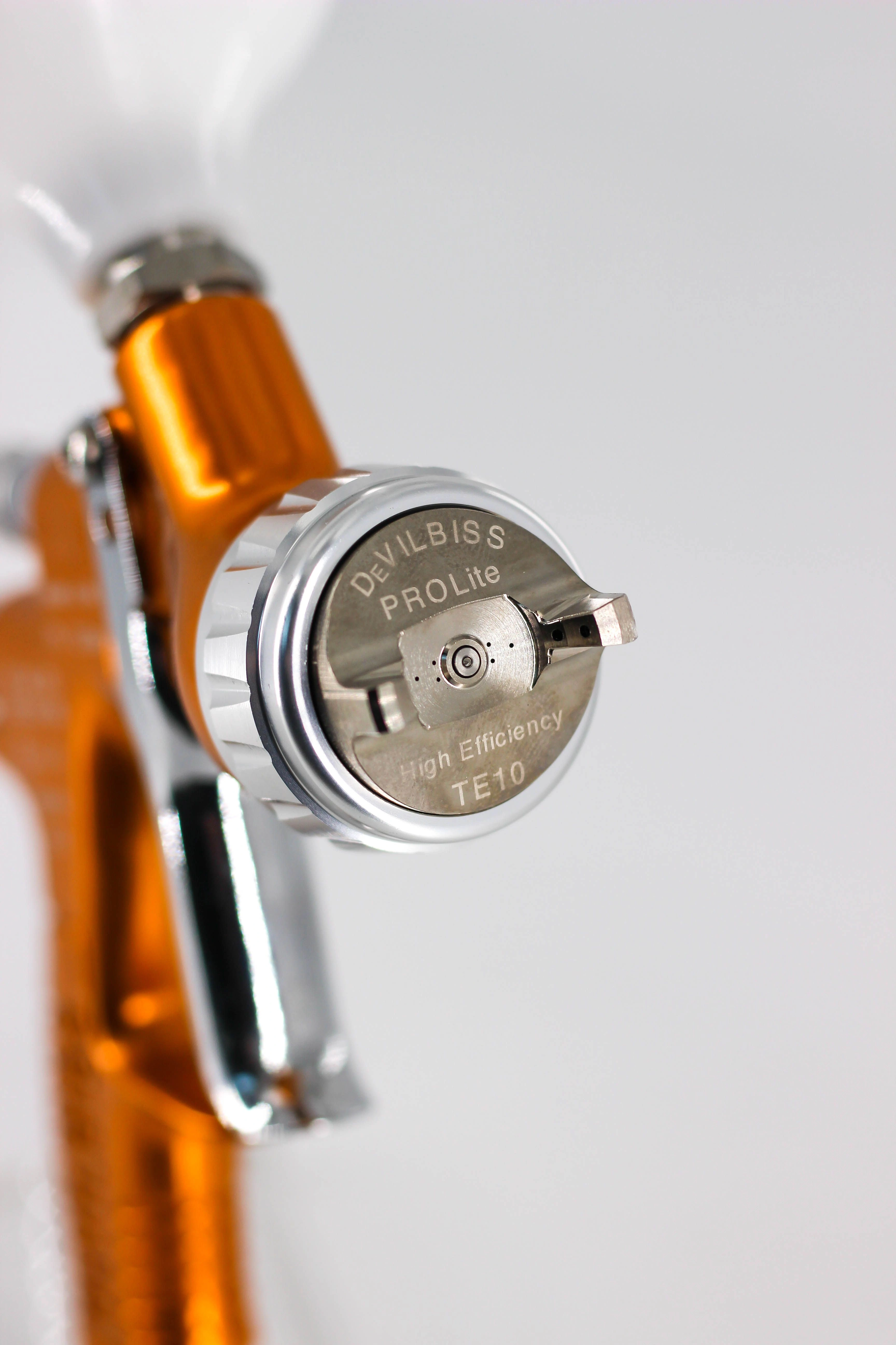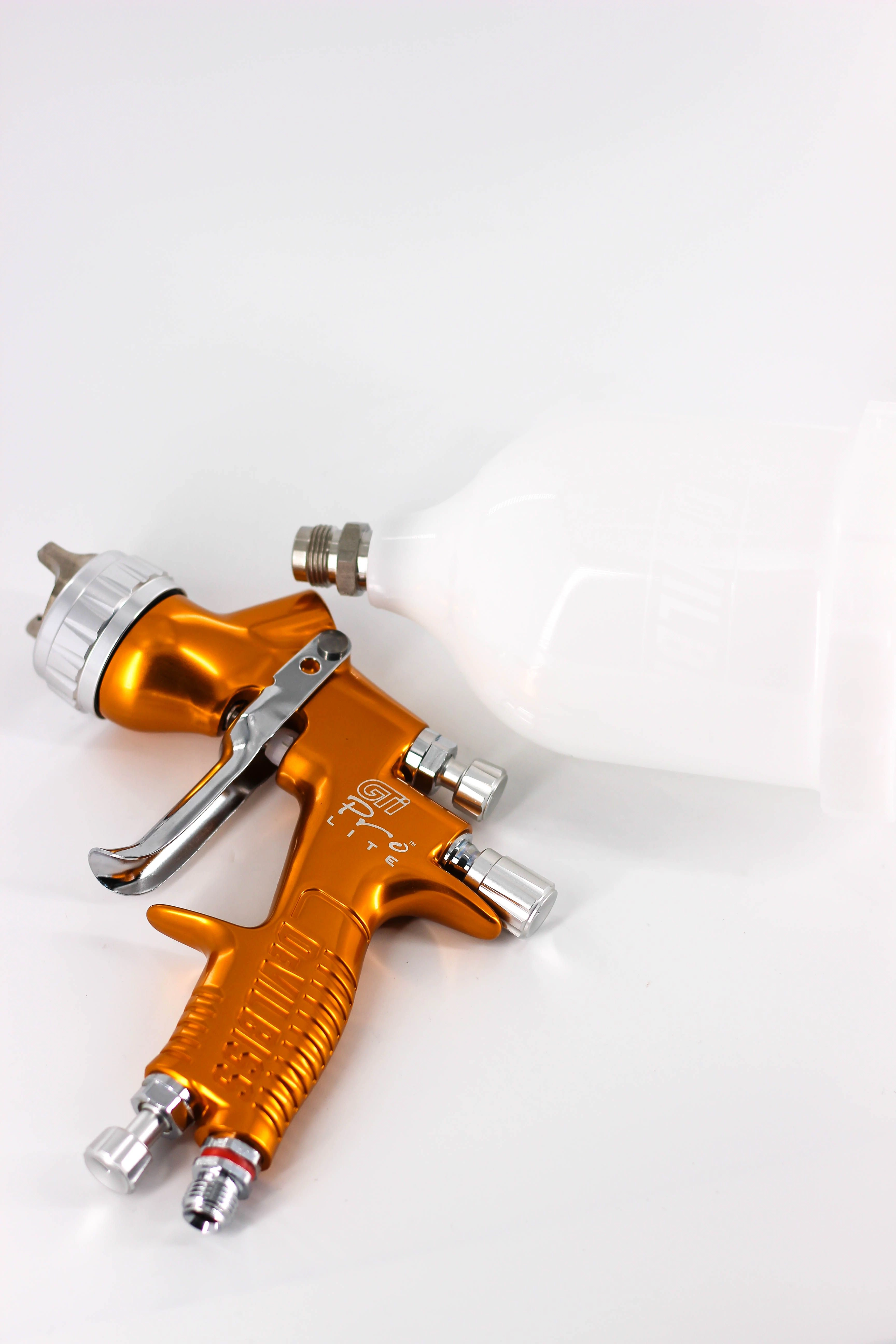 Означает супер легкий, всего 446 граммов, что обеспечивает комфортную длительную работу. Универсальный корпус позволяет использовать его с различными воздушными головами, которые условно можно разделить на "базовые", "лаковые" и "универсальные". С их помощью можно подобрать оборудование для наибольшей точности цветопередачи, а так же для скоростной работы, либо для экономии краски. Кроме того, можно скомплектовать краскопульт DeVilbiss GTi PRO Lite - GTE10 с очень маленьким потреблением воздуха, что бывает очень важно для маленьких мастерских со слабыми компрессорами.