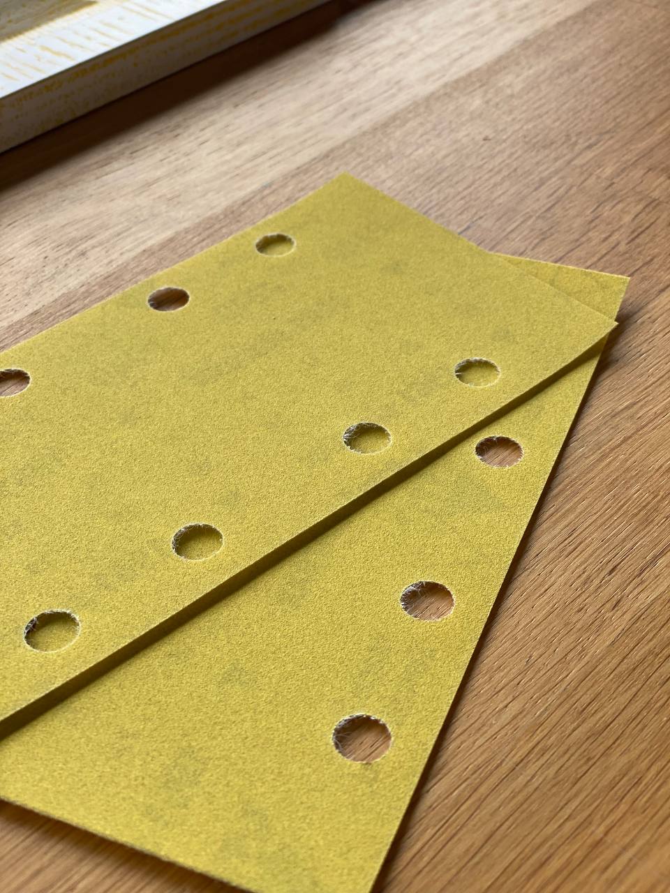 - Отверстия: полоски имеют 8 отверстий, расположенных на равном расстоянии друг от друга. Это предназначено для обеспечения хорошей системы отсасывания пыли и облегчения работы, уменьшая нагрузку на инструмент и повышая качество шлифовки.
