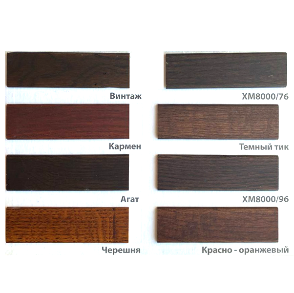Конечный результат колеровки зависит от породы древесины, на который наносится материал, и может не совпадать с цветом на образце.