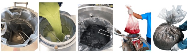 В случае, если загрязнителем являются твердые элементы (краски, пигменты, клей и т.д.), для выгрузки остатка используются одноразовые пакеты EcoBag, которые позволяют выполнить операцию по очистке бака быстро и наиболее безопасно для персонала.