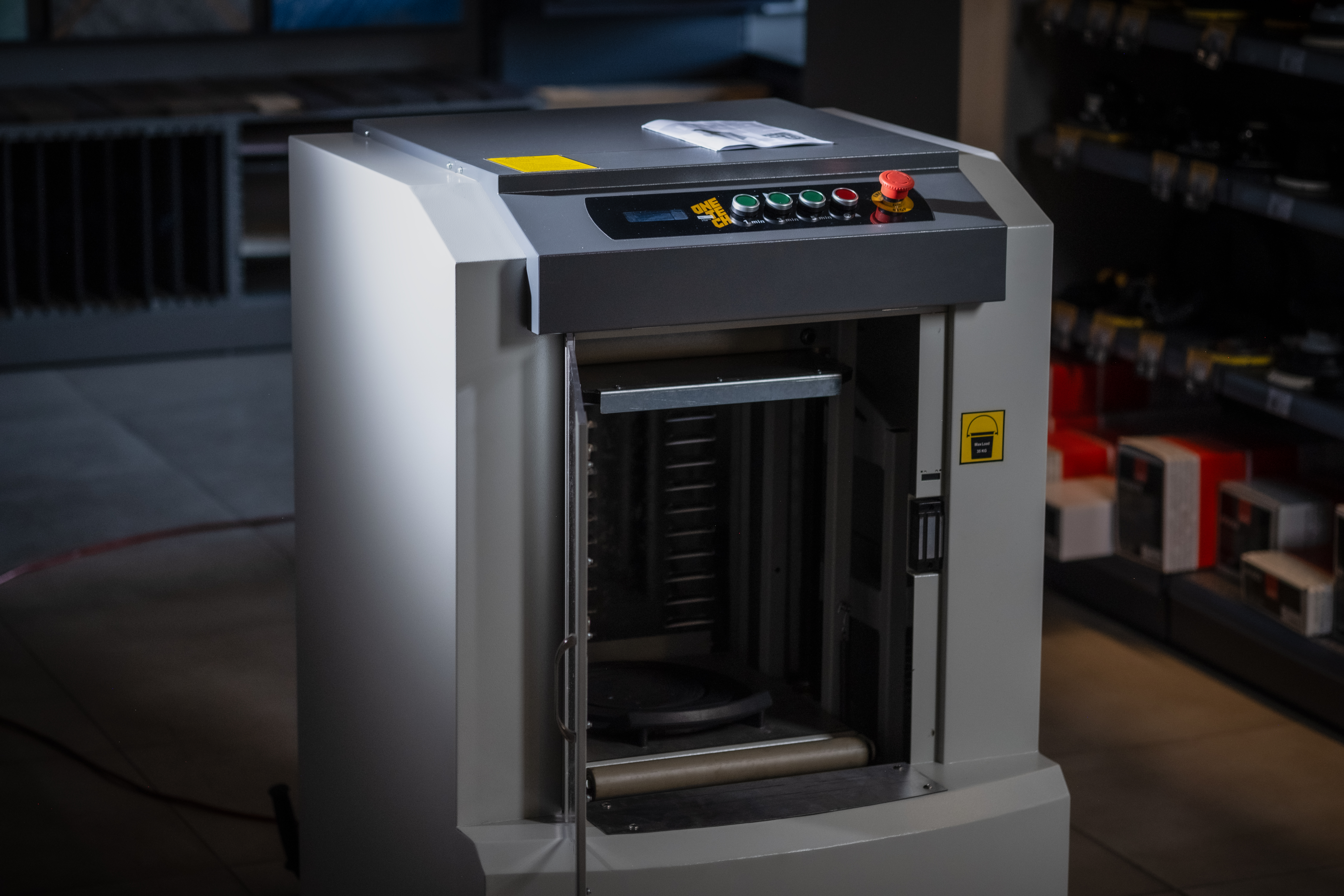 - Экстренный выключатель (кнопка на верхней панели) - шейкер прекращает работу при открытии двери, что гарантирует полную безопасность