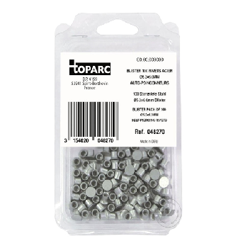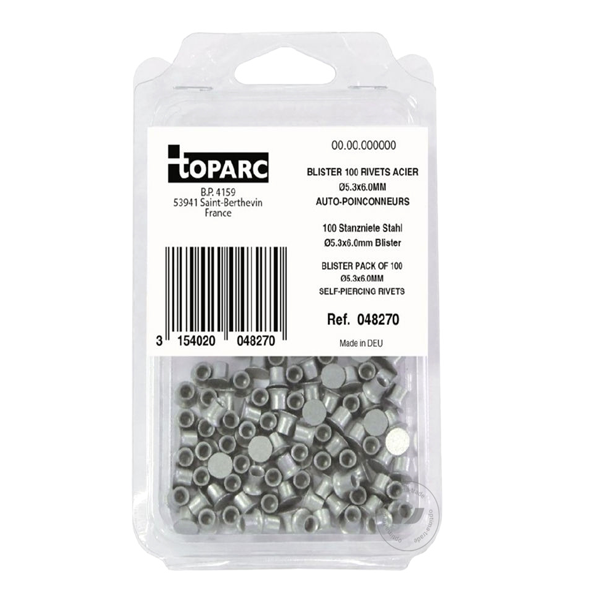 Набор из 100 самопроникающих стальных заклепок, применяемый для создания высокопрочного соединения однородных или разнородных многослойных листовых материалов при помощи заклепочника.